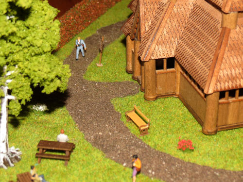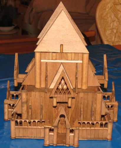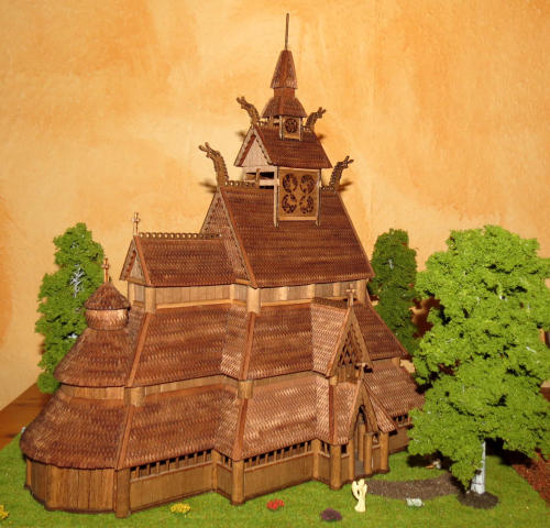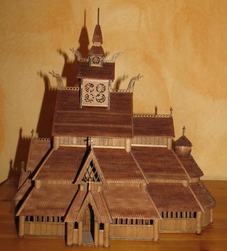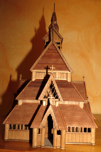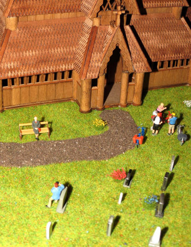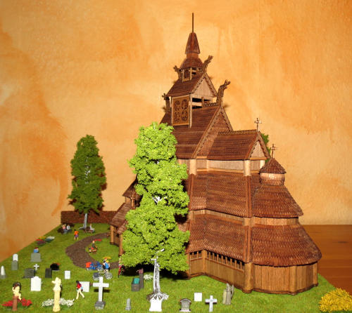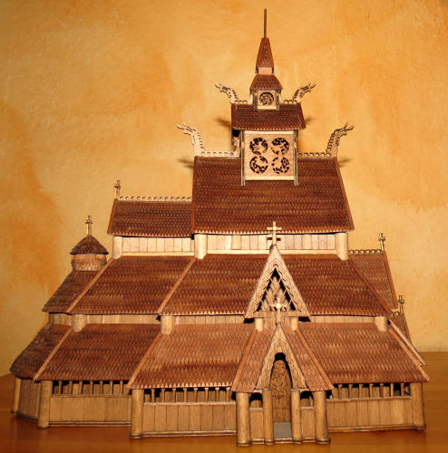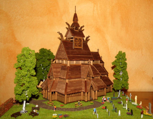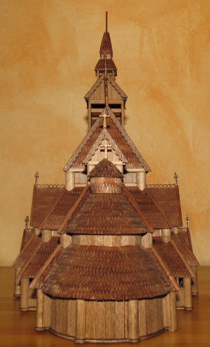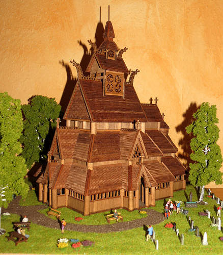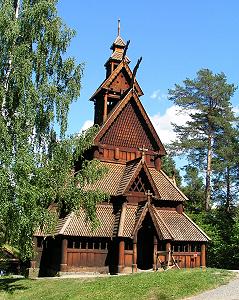 Im Mittelalterpark von Gol befindet sich eine originalgetreue Kopie. Sie ist geweiht und im Sommer werden am Mittwoch um 20 Uhr Andachten gehalten. In der Kirche befindet sich eine Ausstellung über die Architektur der Stabkirchen. Die Stabkirche Gol wurde zu Beginn des 13. Jahrhunderts gebaut, die ältesten Teile der Kirche stammen von 1212. Gebaut wurde die Kirche aus verharztem Kiefernholz. Das Harz sorgte für eine bessere Konservierung des Holzes. Für die Kirche wurden 14 Stäbe (Stämme/Masten) verwendet. Immer wieder fanden Umbauten und Erweiterungen statt. Im 19. Jahrhundert wurde die Sakristei angebaut. |
